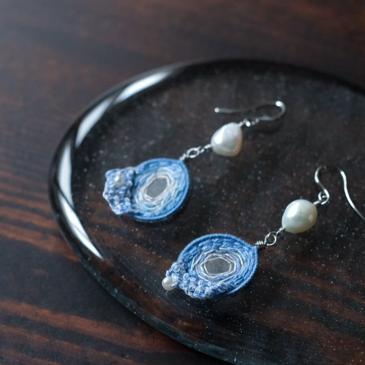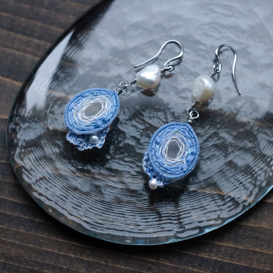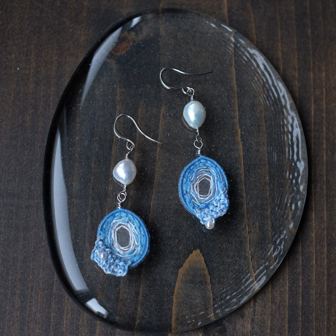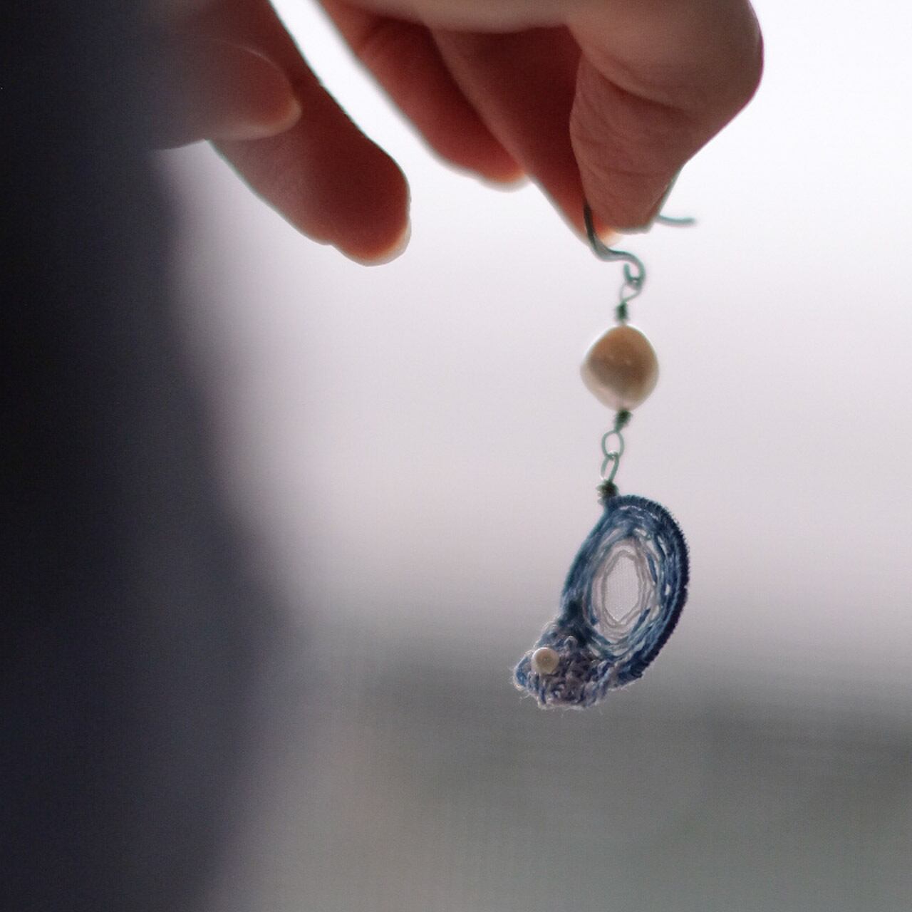 ぐるぐるからはみ出すように立体的な刺繍の中にはパールを一粒。