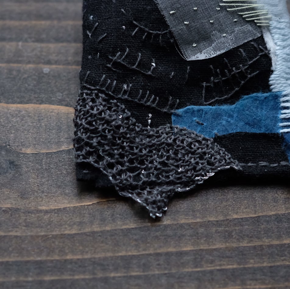 ロウ引き和紙と布を重ねて刺繍してみたり、刺繍糸にラメ糸を重ねたり絡ませたり。